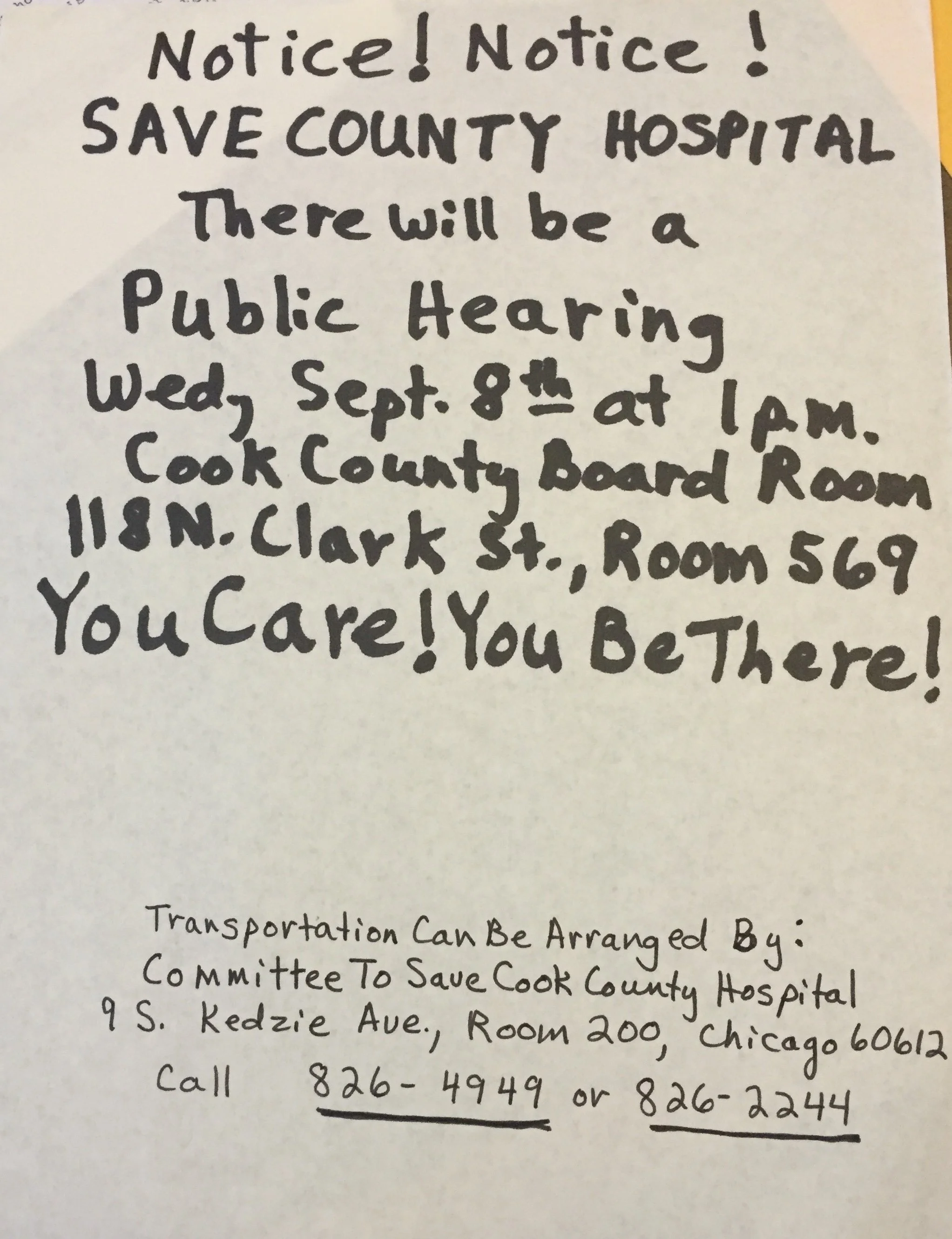 An undated flyer invites community members to get involved in the struggle to save the public hospital.